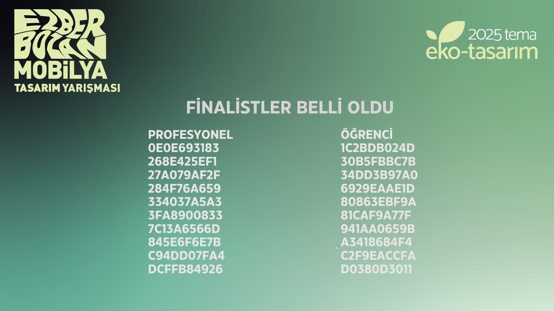 Bu sene “Eko-tasarım” teması kapsamında düzenlenen yarışmanın Berkay Gürsoy, Ece Yalım, Enrique Marti, Fikri Doruk Yorgancıoğlu, Fulden Dehneli, Gamze Güven, Mehmet Mehmetalioğlu, Özlem Yalım, Öznur Turan Eke, Pietro Alba ve Serdal Korkut Avcı’dan oluşan jürisinin yaptığı 3 aşamalı değerlendirmesi sonucunda finalistler belli oldu.