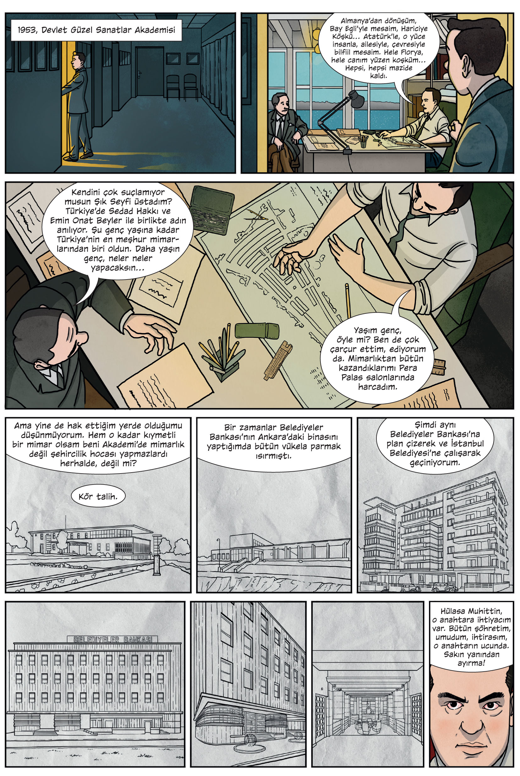 Yüzen Köşk’ün Anahtarı isimli grafik romanın merkezinde Seyfi Arkan ve Arkan’ın tasarladığı Florya Atatürk Deniz Köşkü yer alıyor. Grafik roman, Seyfi Arkan’ın 1928 yılında Sanayi-i Nefise Mektebi Mimari Şubesi’nden mezun olması ve oradan Almanya’ya uzanan hikayesi ile başlıyor.