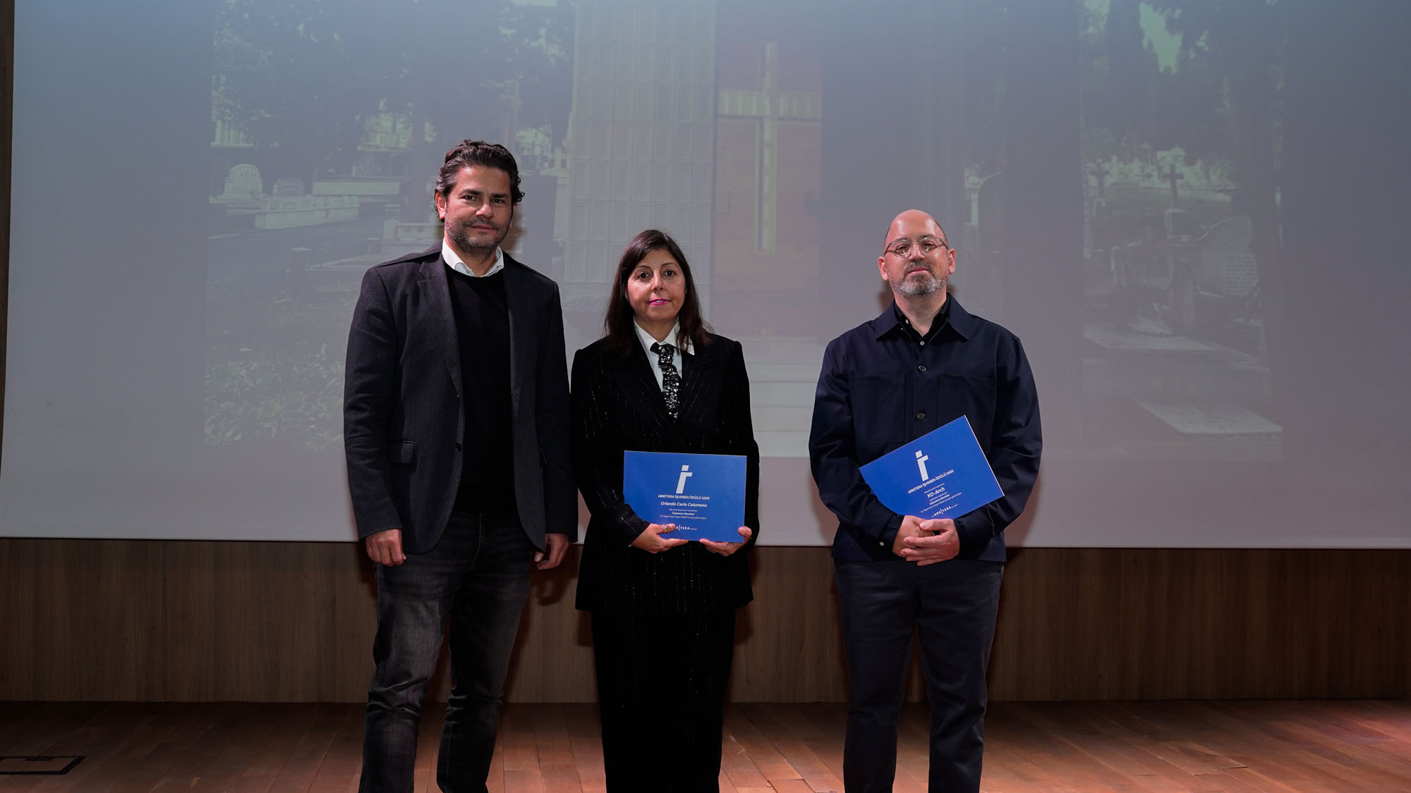 Orlando Carlo Calumeno adına kız kardeşi Serena Kalumenos ile proje müellifi KO-Arch’tan Evren Öztürk plaketlerini Arkitera Genç Mimar Ödülü seçici kurul üyelerinden Jeyan Ülkü’den aldı.