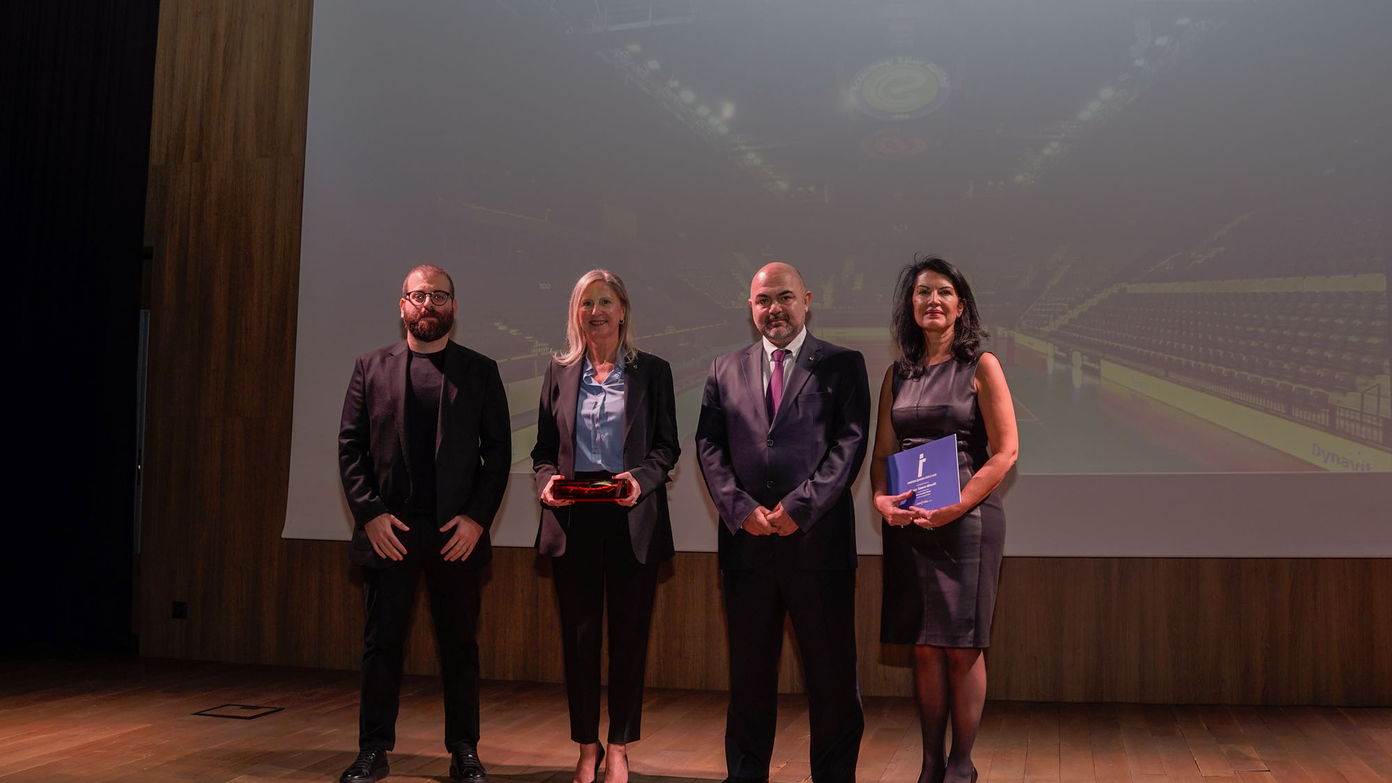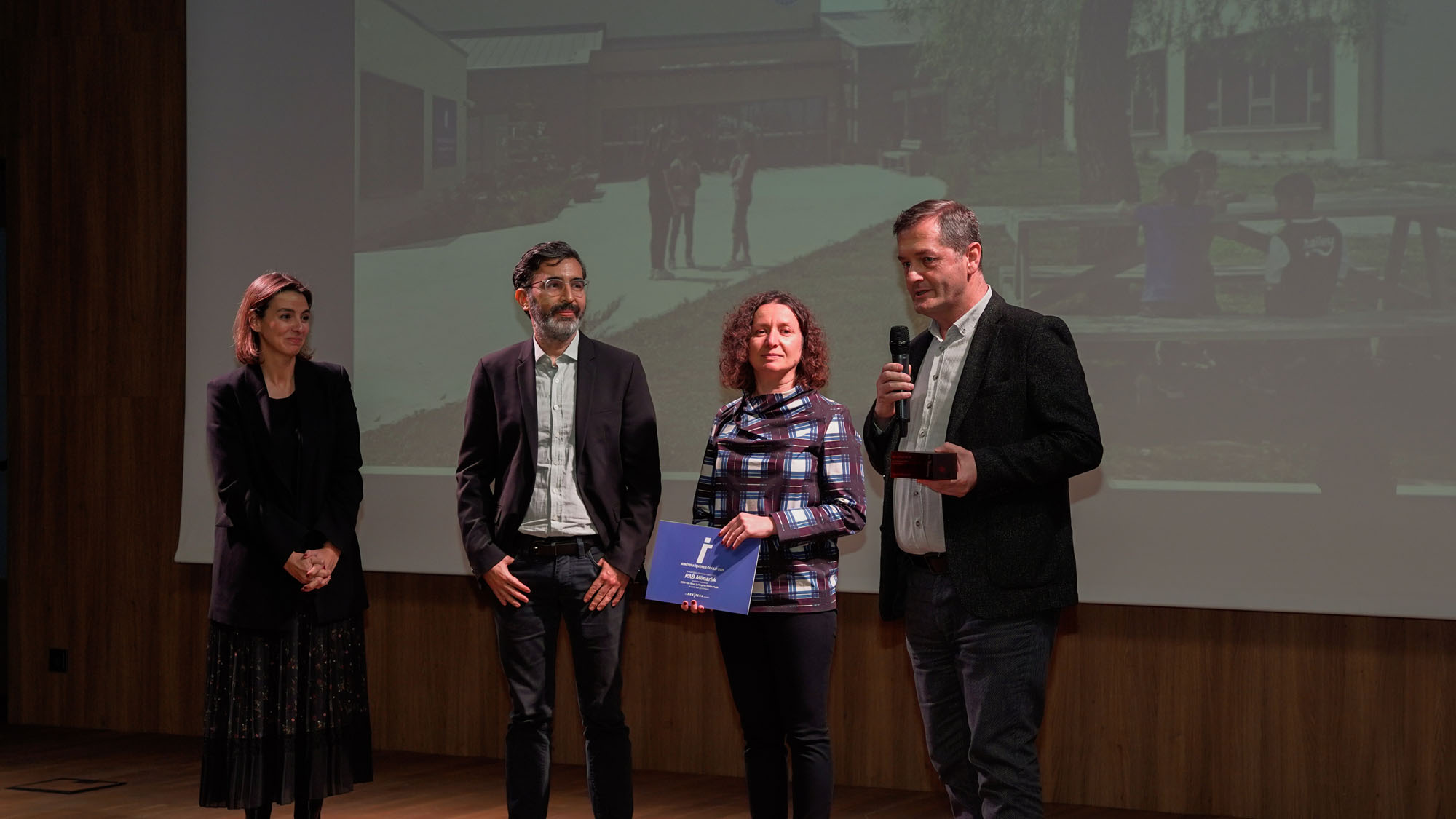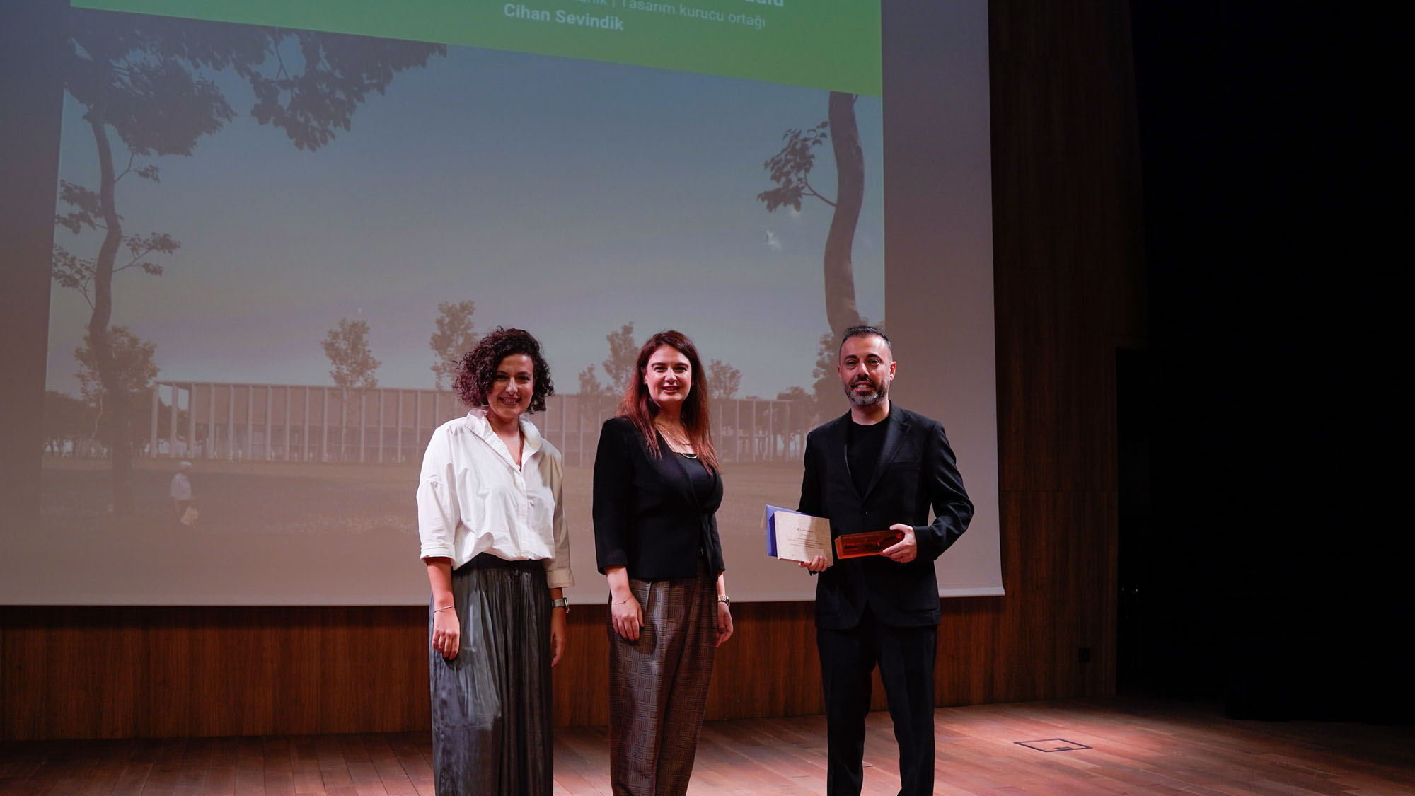 Zonguldak İl Özel İdaresi Yapı Kontrol Müdürü Deniz Kardaş ve proje müellifleri Buda Mimarlık’tan Eda Yazkurt Pelenk ve Burak Pelenk, ödüllerini jüri üyesi Ayça Taylan’dan aldılar.