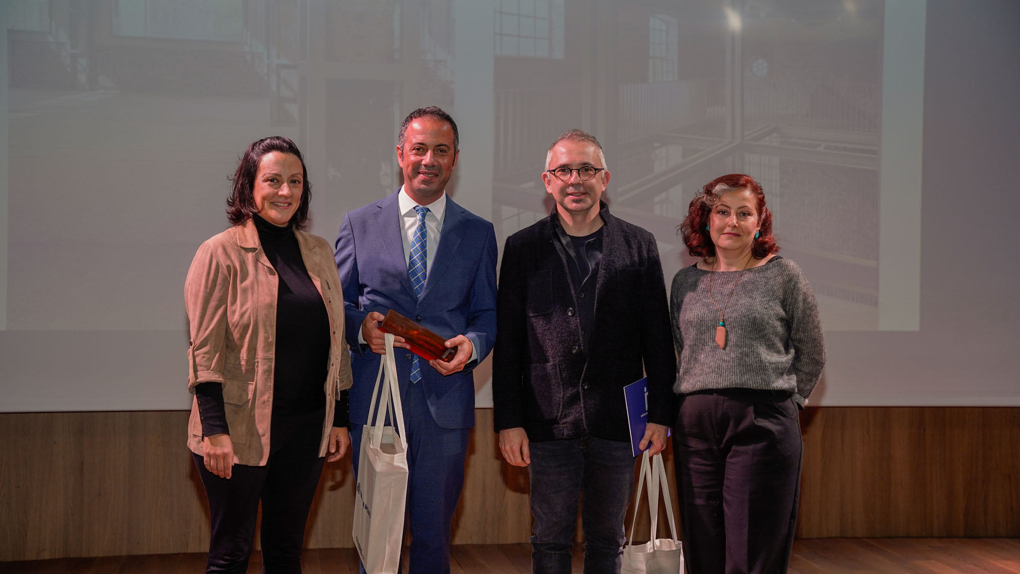 Eczacıbaşı Holding A.Ş. Mimari ve İnşaat İşleri Direktörü Aslı Ayanlar ve İnşaat İşleri Yöneticisi Emrah Özdemir ile Yazgan Tasarım Mimarlık’tan Kamer Sağlam Yiğin ve Elif Kamotar, ödüllerini jüri üyesi Oğuzhan Aydın’dan aldılar.