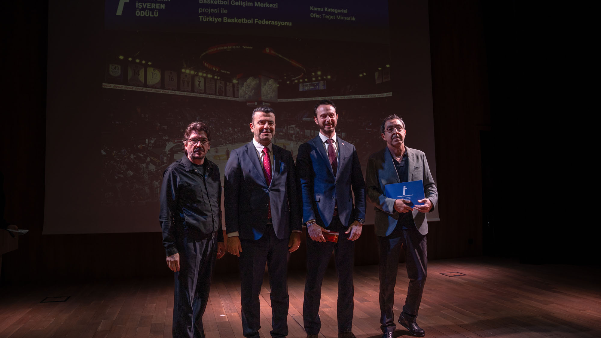 İstanbul Gençlik Spor İl Müdürü Muhittin Özbay ve Türkiye Basketbol Federasyonu Genel Sekreter Yardımcısı Ayberk Açık ve proje müellifi Teğet Mimarlık’tan Ertuğ Uçar, ödüllerini jüri üyesi Ayça Taylan’dan aldılar.